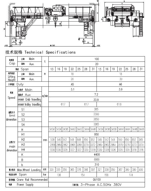 二、 產(chǎn)品簡圖及技術(shù)規(guī)格(QD100/20t)